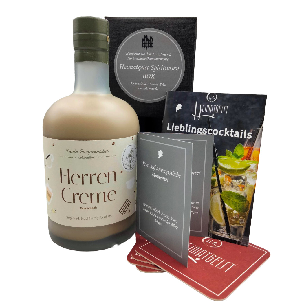Heimatliebe & ein Geschmack, der direkt aus dem Herzen in die Flasche kommt... Unser Likör schmeckt, wie Herrencreme nun einmal schmecken muss: cremig-fein nach Vanille, Schokolade und gutem Rum! Schmeckt nach dem Münsterländer Lieblingsdessert