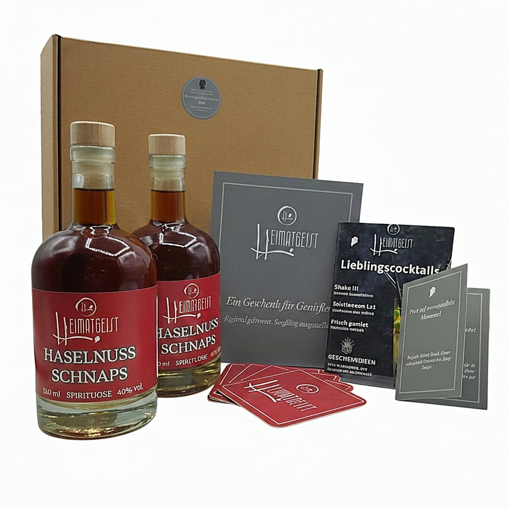 Die Heimatgeist Haselnuss Geschenkbox vereint regionalen Genuss, hochwertige Qualität und liebevolle Details in einem stilvollen Set. Zwei Flaschen unseres charakterstarken Heimatgeist Haselnussschnaps werden in einem Geschenkkarton präsentiert – ergänzt durch ausgewähltes Zubehör, das jedes Genießerherz höherschlagen lässt.